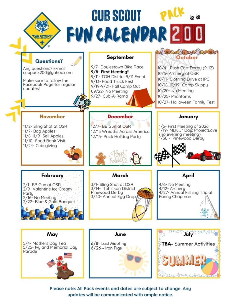 From campouts to Pinewood Derby, Pack 200 is always on the move! Check out our upcoming events below and mark your calendars for the fun.